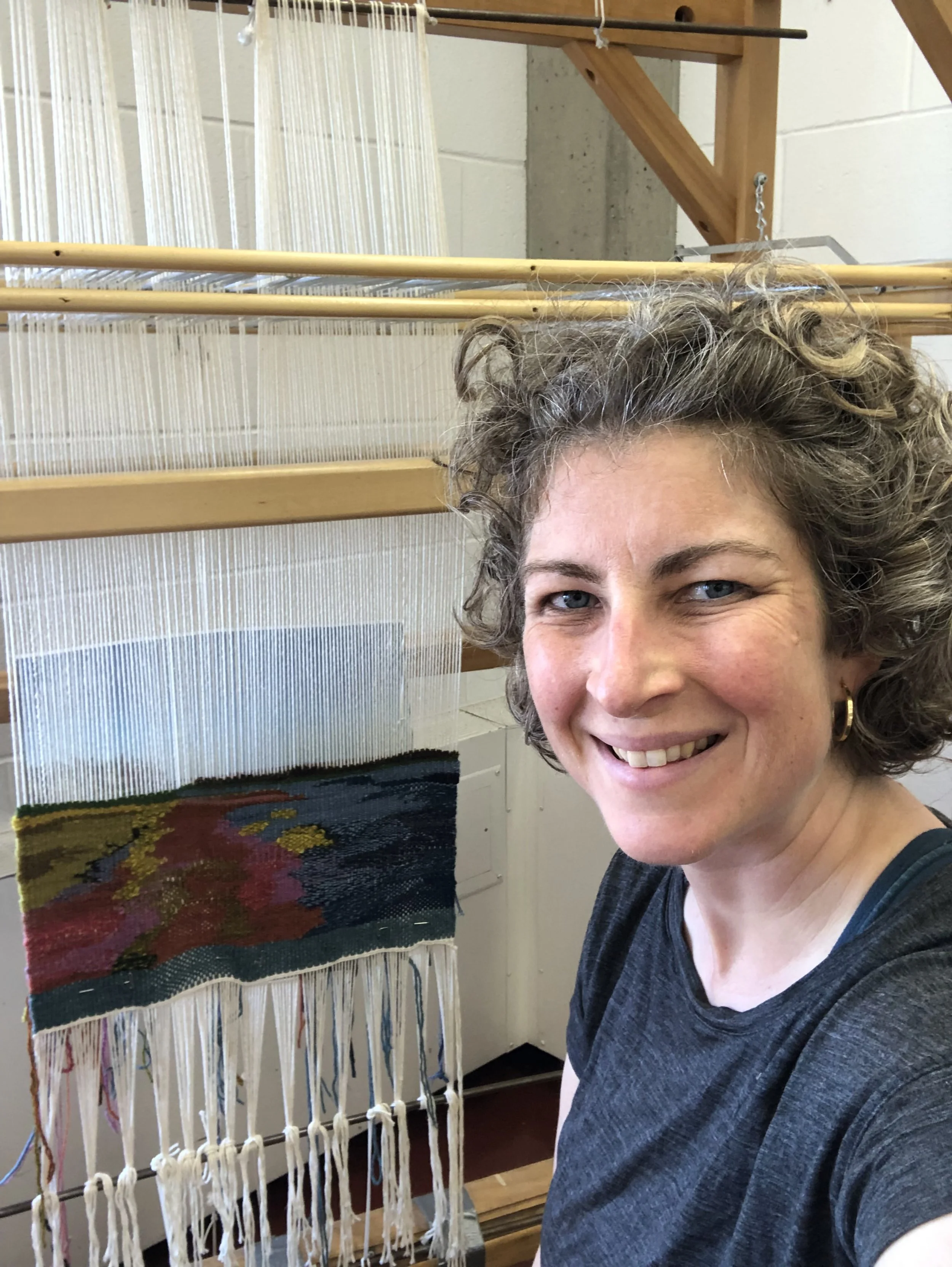 In the spring/summer of 2024, I was invited to participate in a Self-Directed Residency Program organized by Contextural Fibre Co-op and hosted at the Alberta University for the Arts. I had a few projects in mind, but did not expect to actually have the opportunity to work on a massive stand-up loom. While the residency was self-directed, I did have some guidance from an AUArts staff on setting up my warp on the loom and taking it off. I was relieved! I decided to experiment weaving a PEI landscape painting that my mom made. It was really hard at first to approach weaving on such a big loom and do a landscape in this way, but it did get easier over many hours of practice. In addition to this big project, I submitted a small weaving to the final summer Contextural exhibit at AUArts on the theme of “Exposure”.